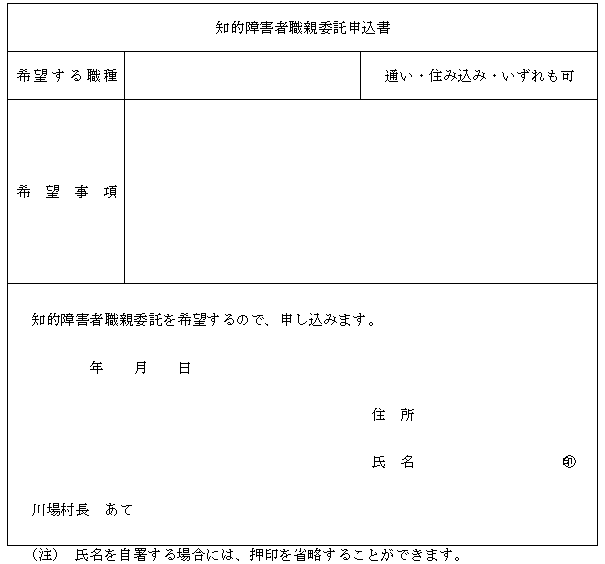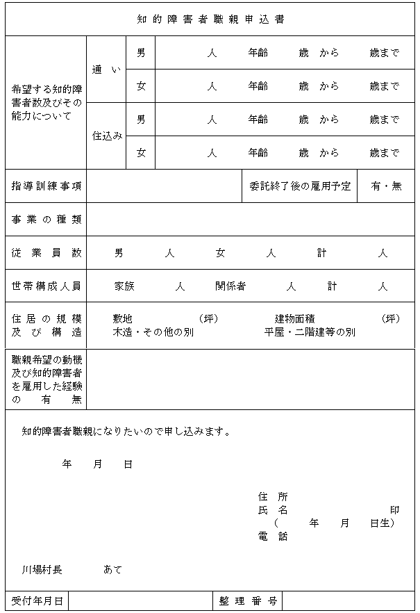 第5条 職親になることを希望する者(以下「希望者」という。)は、知的障害者職親申込書(別記様式第2号)により村長に申し込まなければならない。