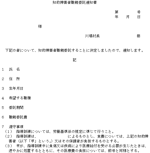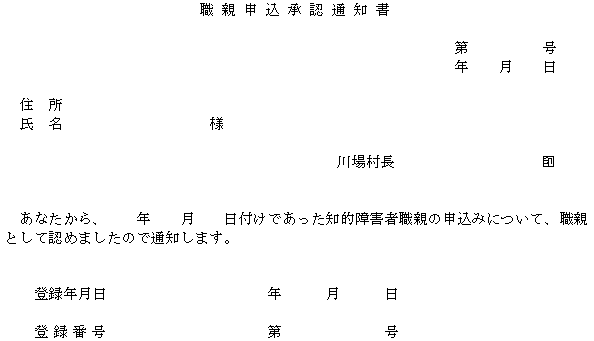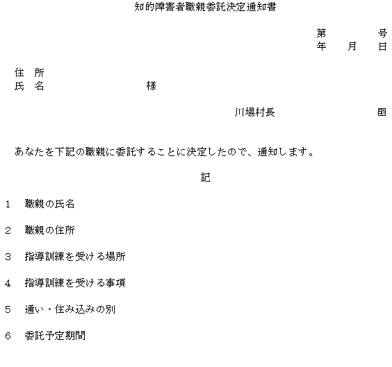 3 村長は、職親委託を決定したときは、知的障害者職親委託通知書(別記様式第10号)により職親に通知するものとする。この場合において、職親登録簿に委託に関し必要事項を記載するものとする。
