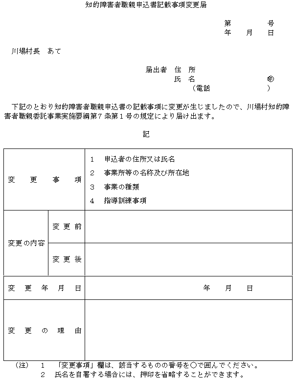 (1) 知的障害者職親申込書の記載事項に変更が生じたとき。知的障害者職親申込書記載事項変更届(別記様式第6号)